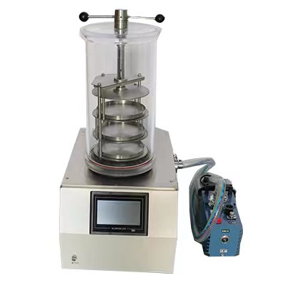 臺式凍干機(1臺)、真空泵(1臺)2XZ-2/2XZ-4可選、玻璃罩(1個,含壓蓋裝置)、不銹鋼樣品架(1個)、不銹鋼樣品盤(3個)、真空連接管(1根)、●可選配:(1)進口真空泵(2)油霧過濾器(3)防返油裝置